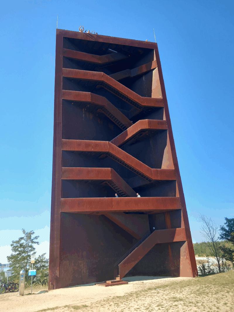 Unser Ziel war diesmal nicht der See als solches, sondern der "Rostige Nagel". So heißt dieser Aussichtsturm am "Seedlitzer See". Natürlich wurde er von drei Teilnehmer nackt bestiegen. Ich blieb freiwillig unten, denn einer musste ja das Foto schießen: